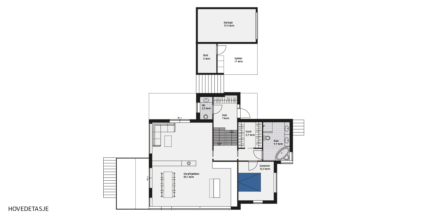 I tillegg til romslighet har dette huset mange andre kvaliteter. Huset er en symfoni av lys og luft – gjennomlys og gode løsninger. Romsligheten starter ute. Her er plass til både bil og sykler i forbindelse med carport og bod! Inngangen er på mellomplan, med trapp opp en halv etasje til hovedplanet.