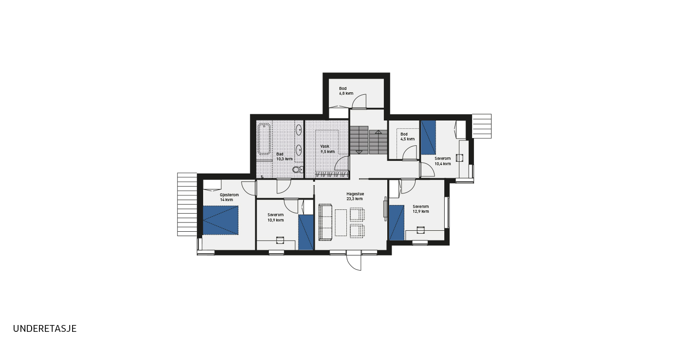 Hele fire store soverom, stort bad og hagestue med utgang til hagen står klar. I underetasjen finner vi også et praktisk vaskerom. Og aller nederst – enda noen trinn ned – ligger en bod som kan brukes til mye – hva for eksempel med sin egen vinkjeller?